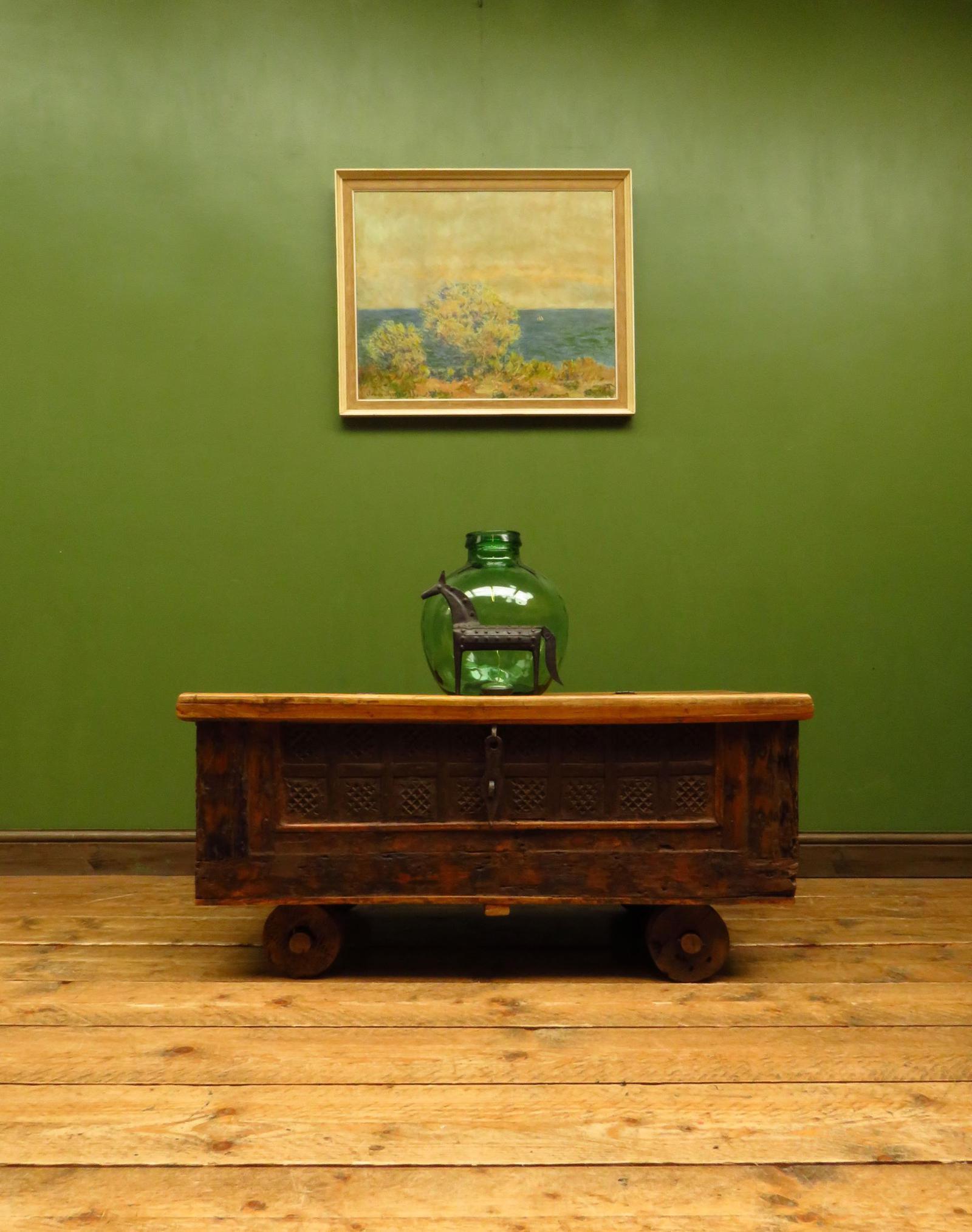 Antique Indian Coffee Table Chest on Wheels, Large interior Storage Space