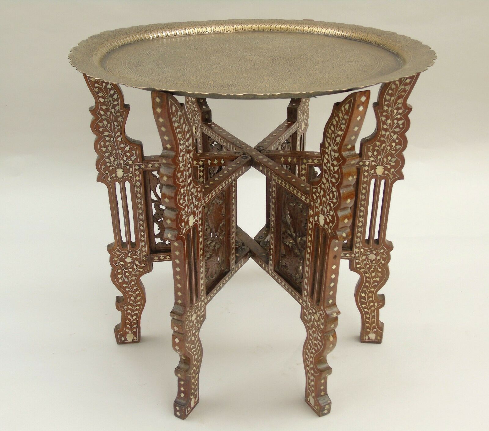Antique Inlaid Islamic Hardwood Table Brass Top C.1890 (1 of 9)