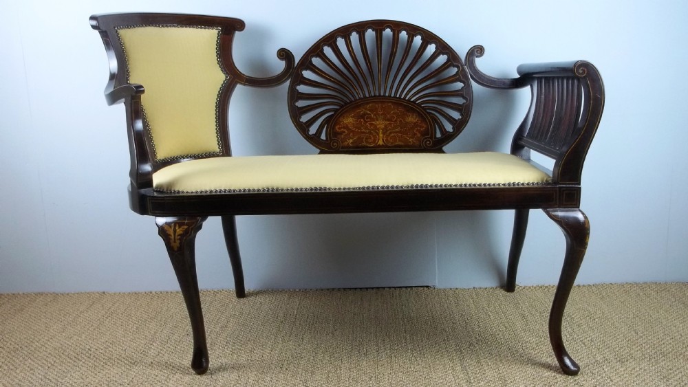 Antique Inlaid Mahogany Upholstered Two Seat Salon Cameo Chair Settee Sofa Window Couch