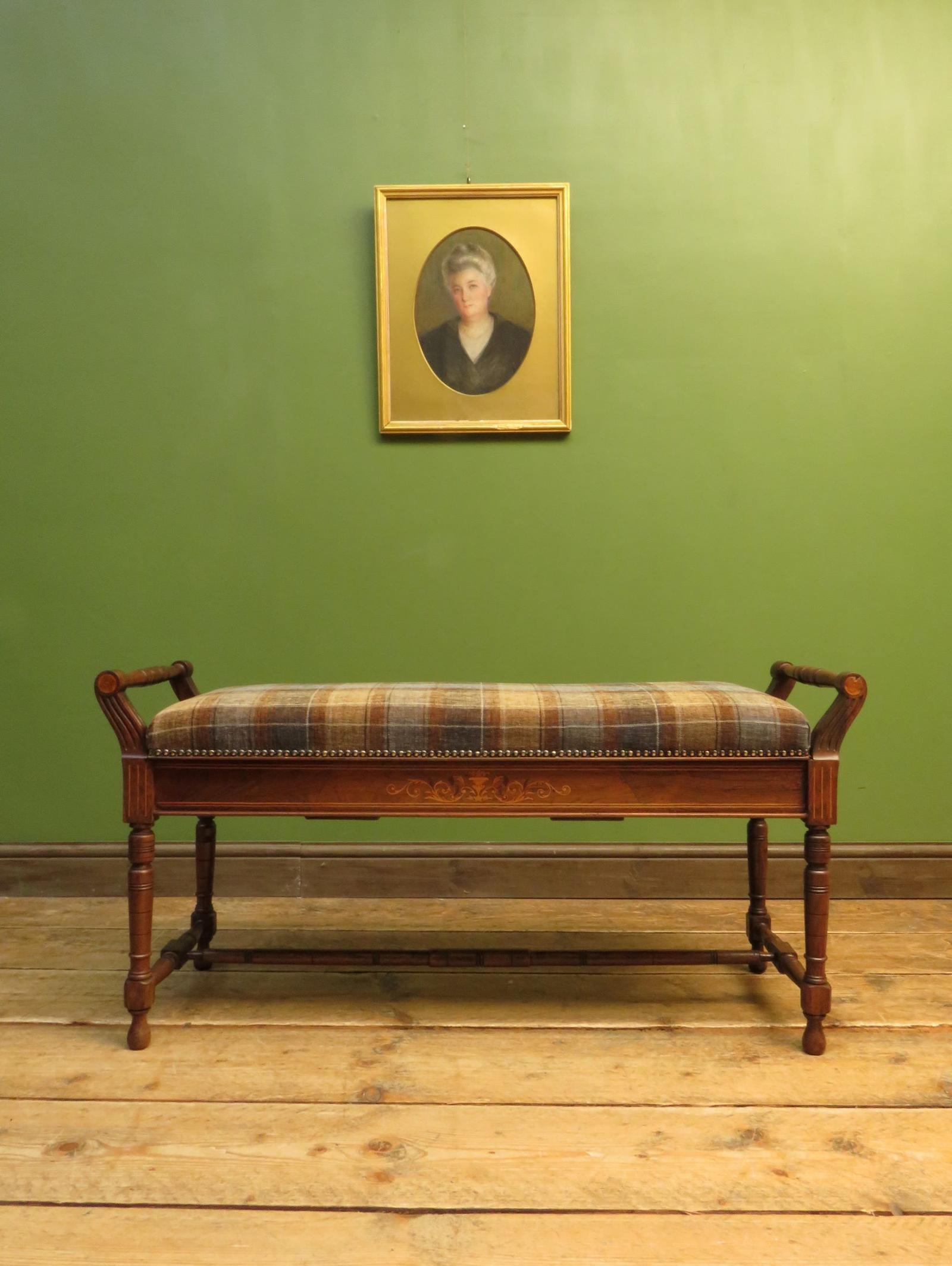 Antique Inlaid Rosewood Piano Duet Stool with Newly Upholstered Seat