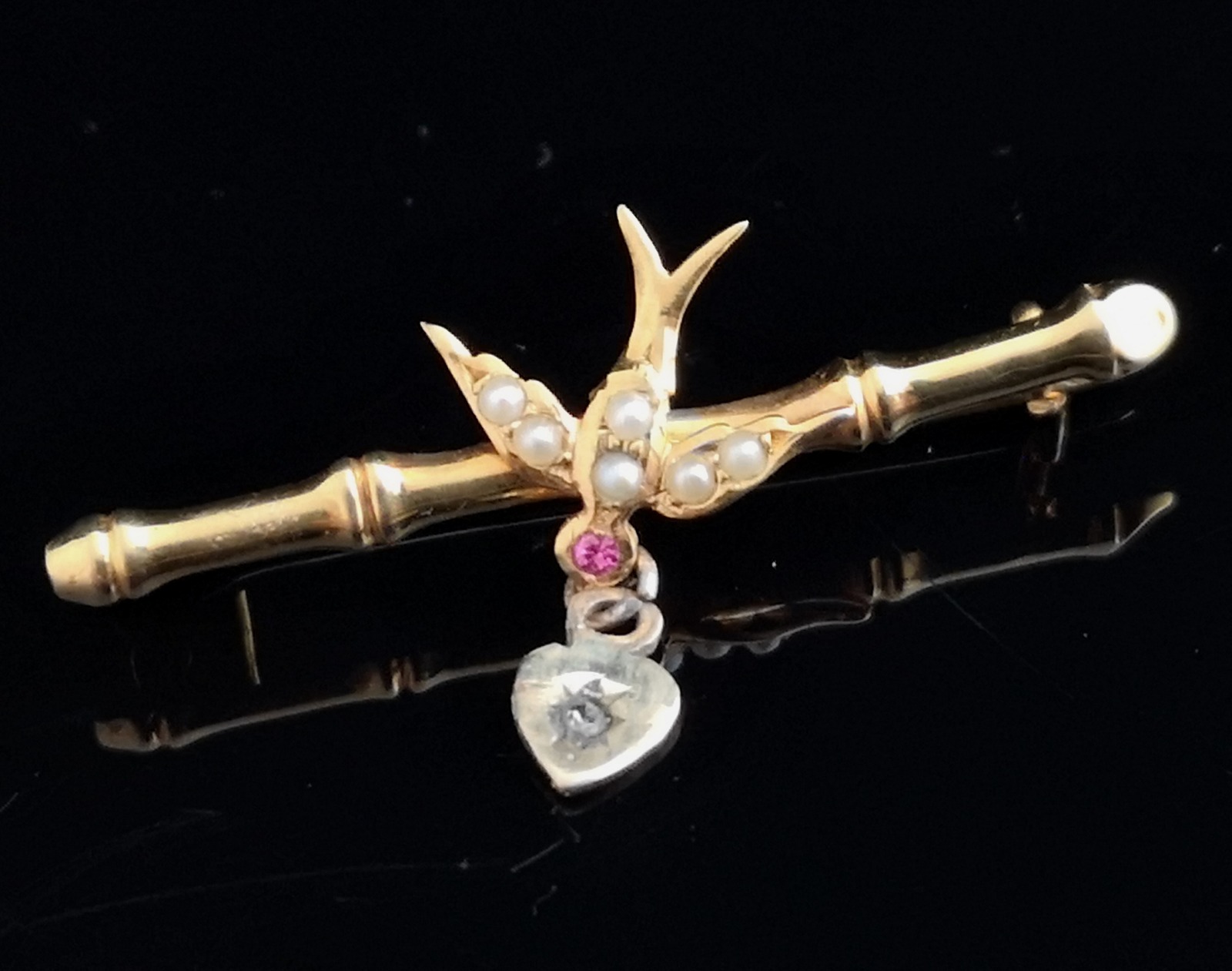 Antique Irish 9ct Gold Swallow Brooch, Ruby, Pearl & Diamond