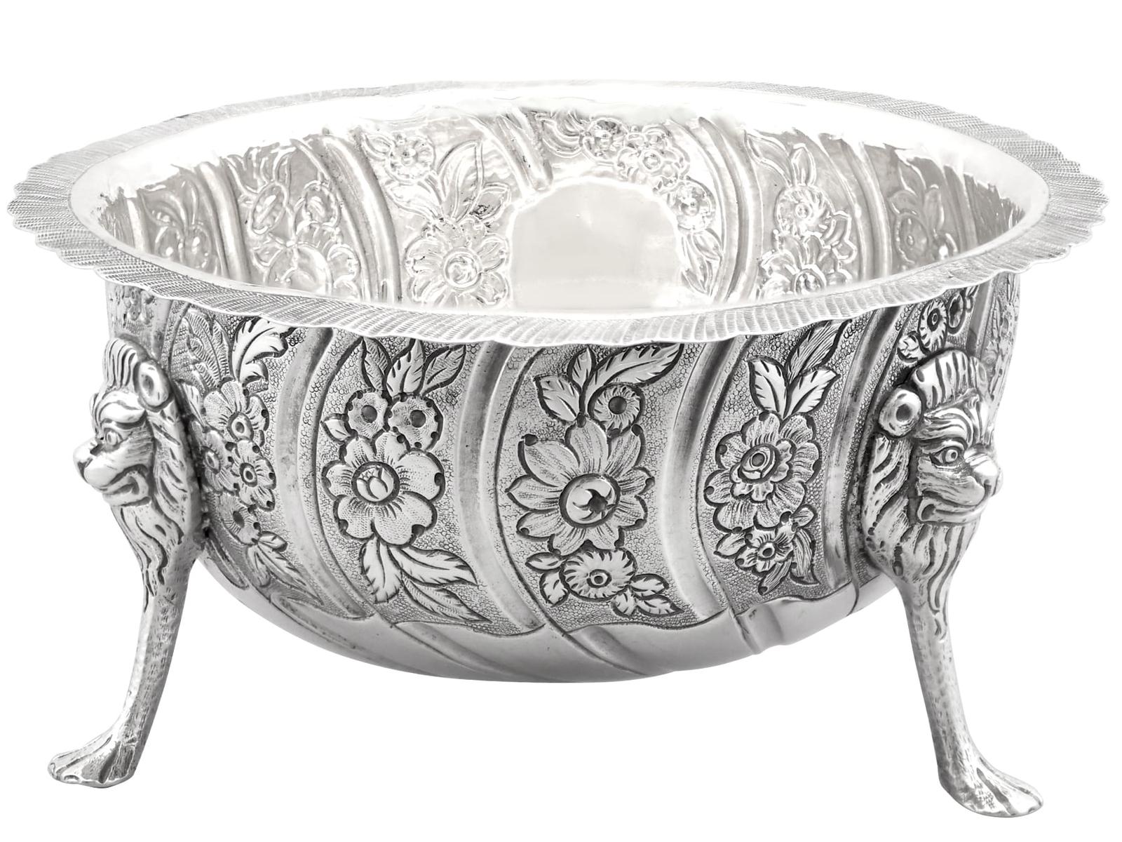 This antique bowl is supported by three exceptional cast and applied sterling silver paw style feet accented with an impressive lion mask design in junction with the body.