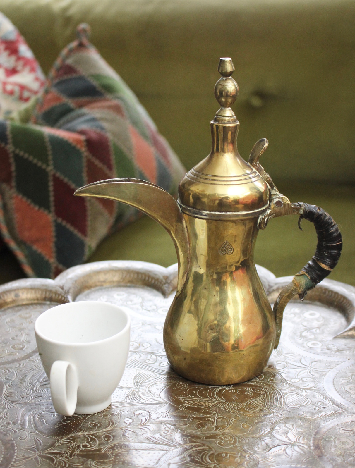 Antique Islamic Bedouin Arabic Dallah, Brass, Signed, Tin Lined, Leather Handle