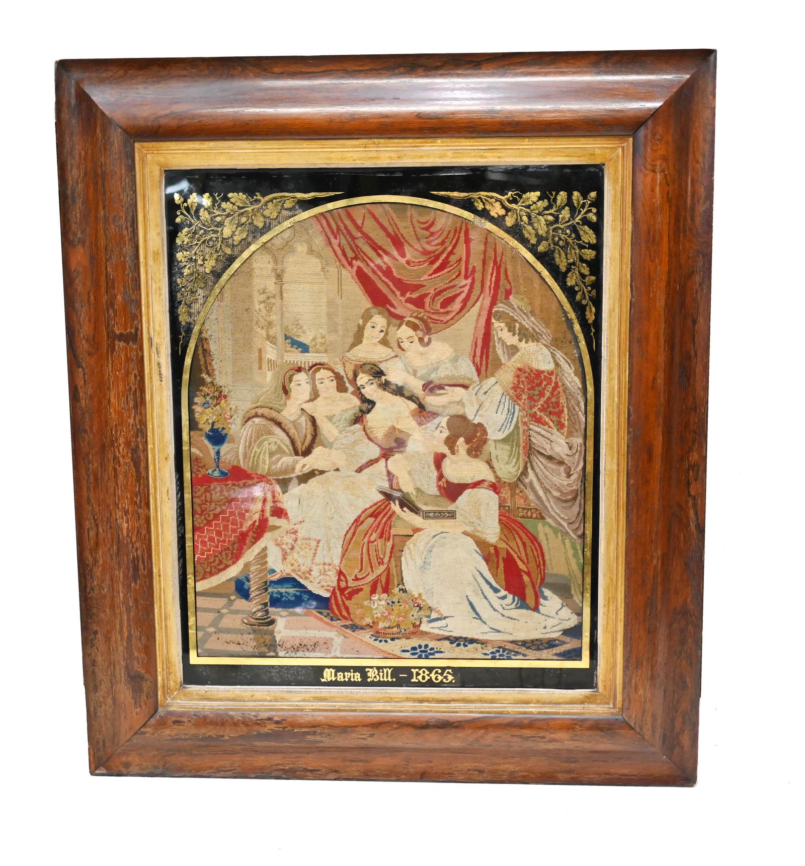 Antique Italian Needlepoint Tapestry Courtly Maidens 1865