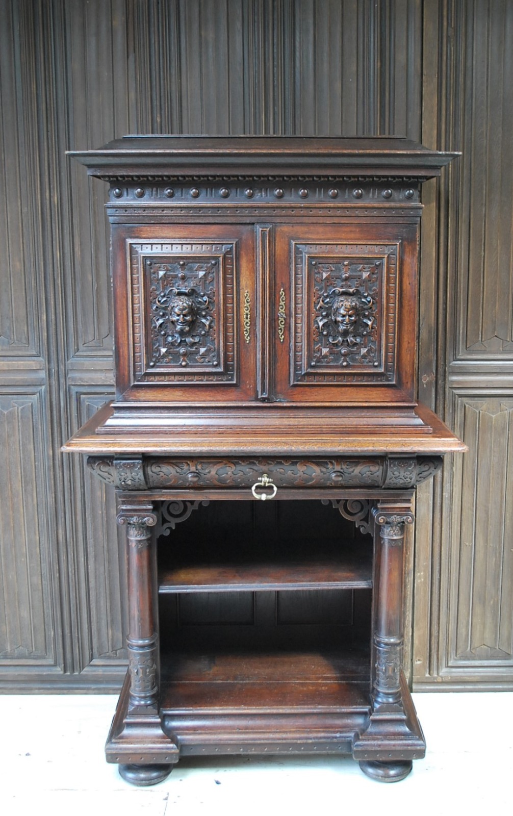 Antique Italian Oak Renaissance Revival Collectors Cabinet on Stand