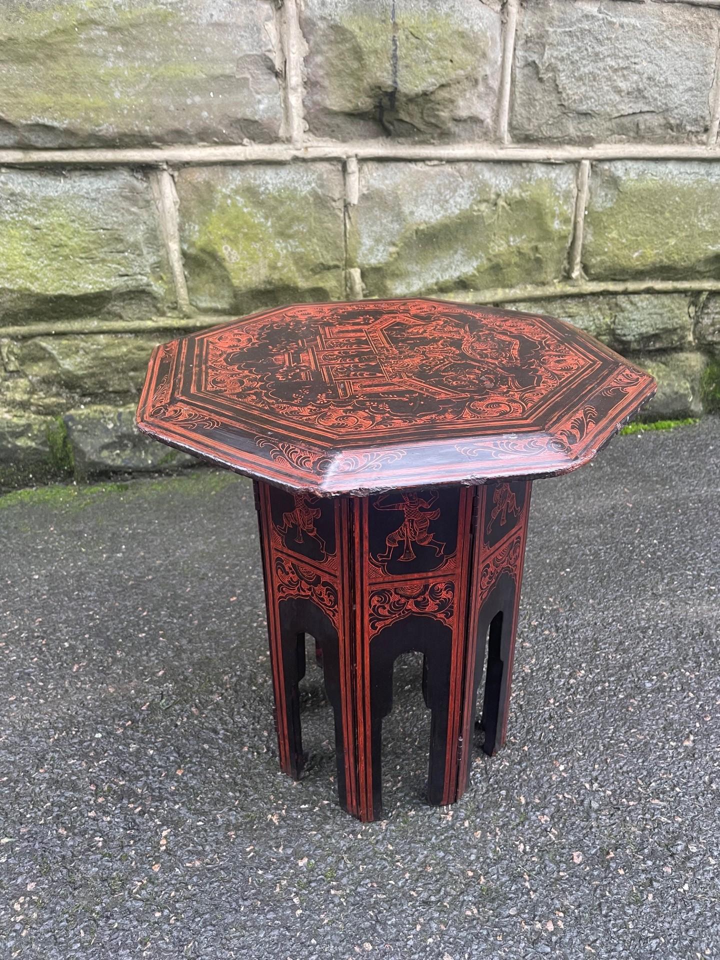 In the Moorish style , black lacquered finish with red painted detail. The hexagonal top sits upon the folding concertina stand