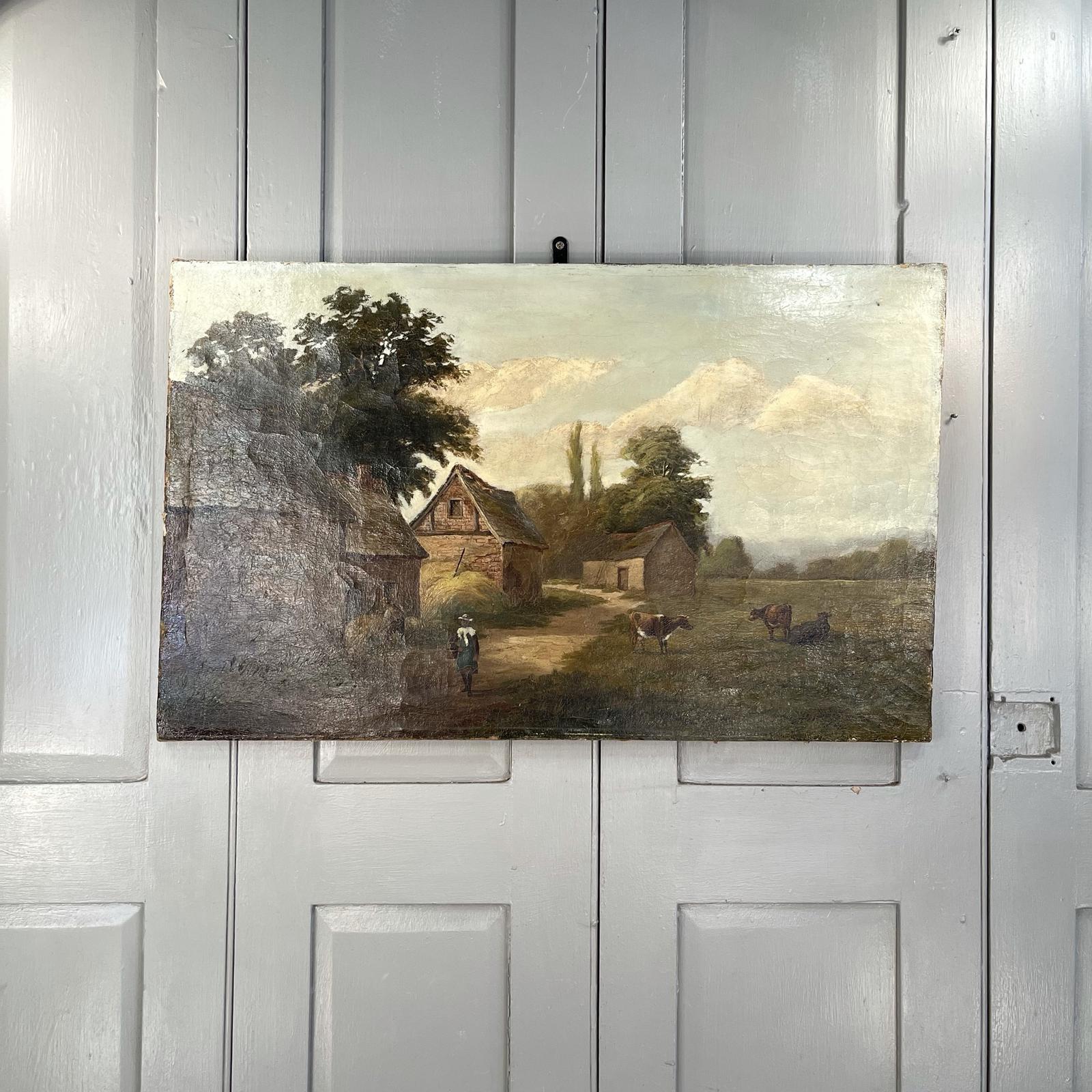 Antique Landscape Oil Painting of Farm Buildings with Cows Signed WP Cartwright 1892