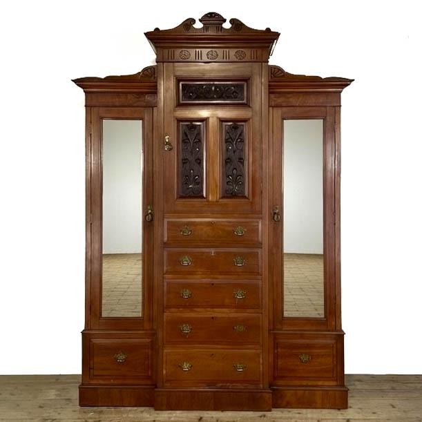 An impressive large antique mahogany wardrobe. The wardrobe is of substantial proportions and is surmounted by a decorative moulded cornice with carved detail to the frieze. The front is arranged with a central cupboard above a bank of graduated drawers, flanked by a pair of full-length mirrored doors. The central door is fitted with carved panels and opens to reveal hanging space within. Below, there are a series of drawers fitted with original brass handles, all well made and of good depth. The side cupboards open to further hanging compartments, each fitted with rails and retaining their original internal fittings, with additional drawers set to the base.