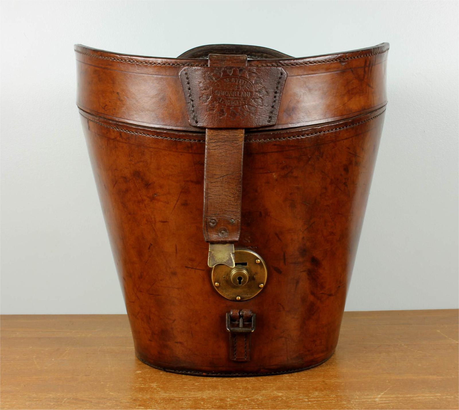 This great looking hat case which has a fabulous patina is nice and tall, well made of thick quality leather tan, the inside has a red silk lining, a brass lock plate that is stamped with Secure London, sturdy carrying handle and there is a long leather holding strap. This does not hold the lid shut when carrying as we do not have a key to unlock the case.