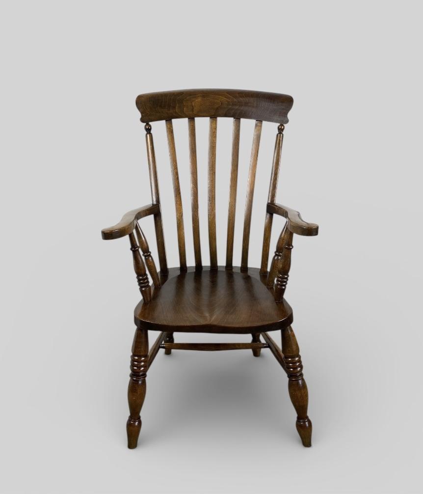 A solid, late 19th-century armchair in the classic Windsor style. Constructed with a solid Elm seat and a Beech frame, featuring a traditional high-back lath design and turned legs.