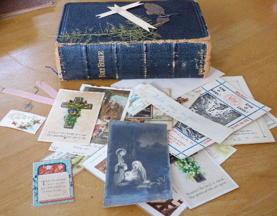 Antique Late Victorian ‘Holy Bible’ with Collection of Book Marks, Pressed Leaves Etc…