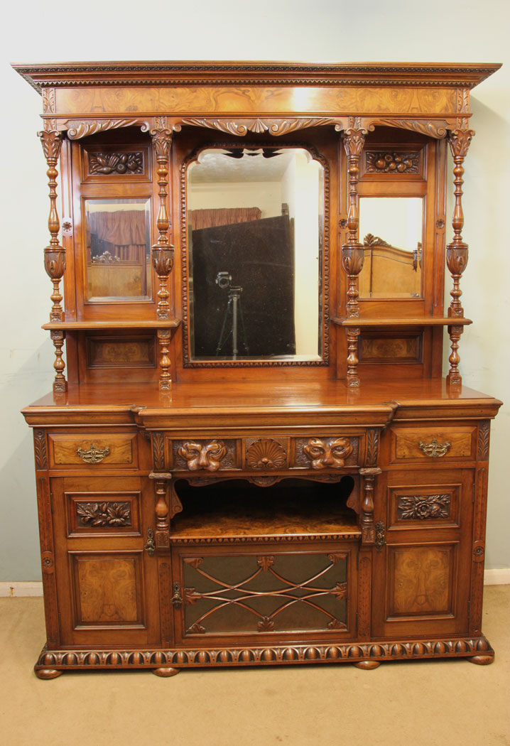 Antique Late Victorian Walnut Mirror Back Breakfront Sideboard