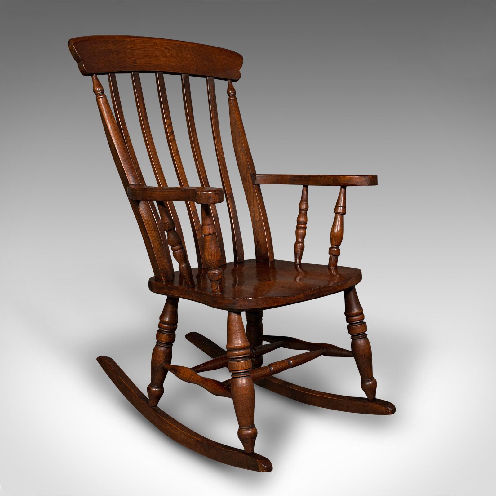Antique Lathe Back Rocking Chair, English Oak, Beech, Elbow Seat, Victorian, 1900