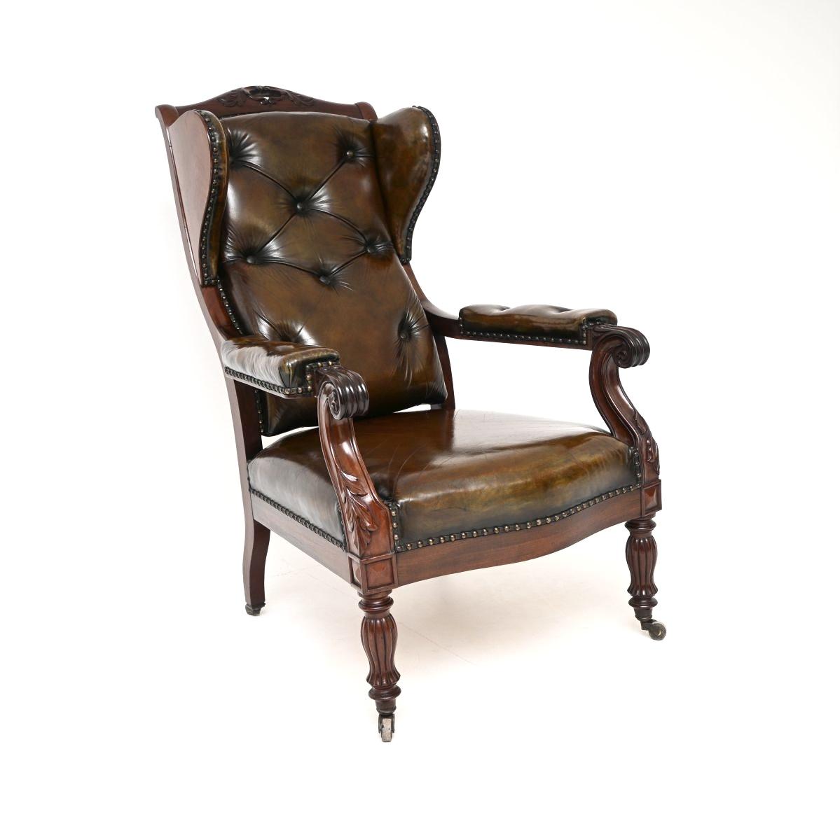 An exceptional antique leather and walnut wing back armchair. This is possibly Irish or English, it dates from around the 1820-1840 period. We have said this is walnut, but it’s really hard to be sure, because of the wonderful patina, so it could equally be mahogany.