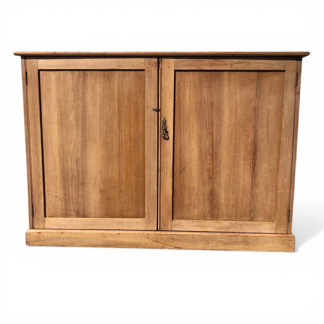Antique wood two door shallow cupboard made around 1910 probably. The timber is very similar to pine but is actually a light coloured hardwood of some sort. Two large panelled doors, one with a brass handle, the other having a brass turn button and internal bolt to hold them both shut. Two removable shelves inside. Plinth at the base.