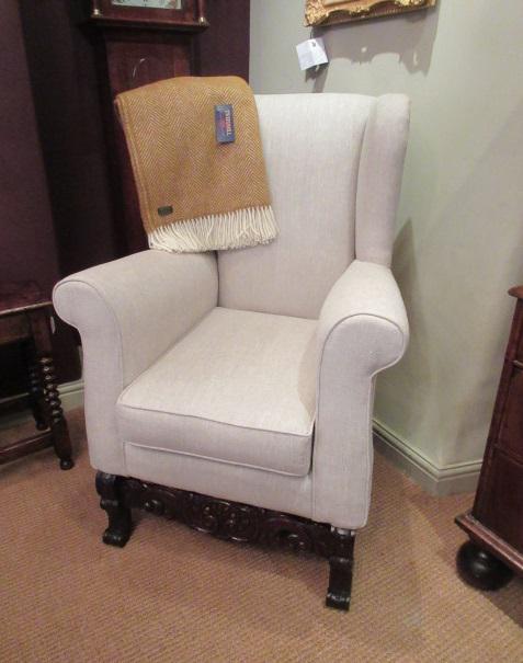 Antique Linen Upholstered Wing Back Armchair
