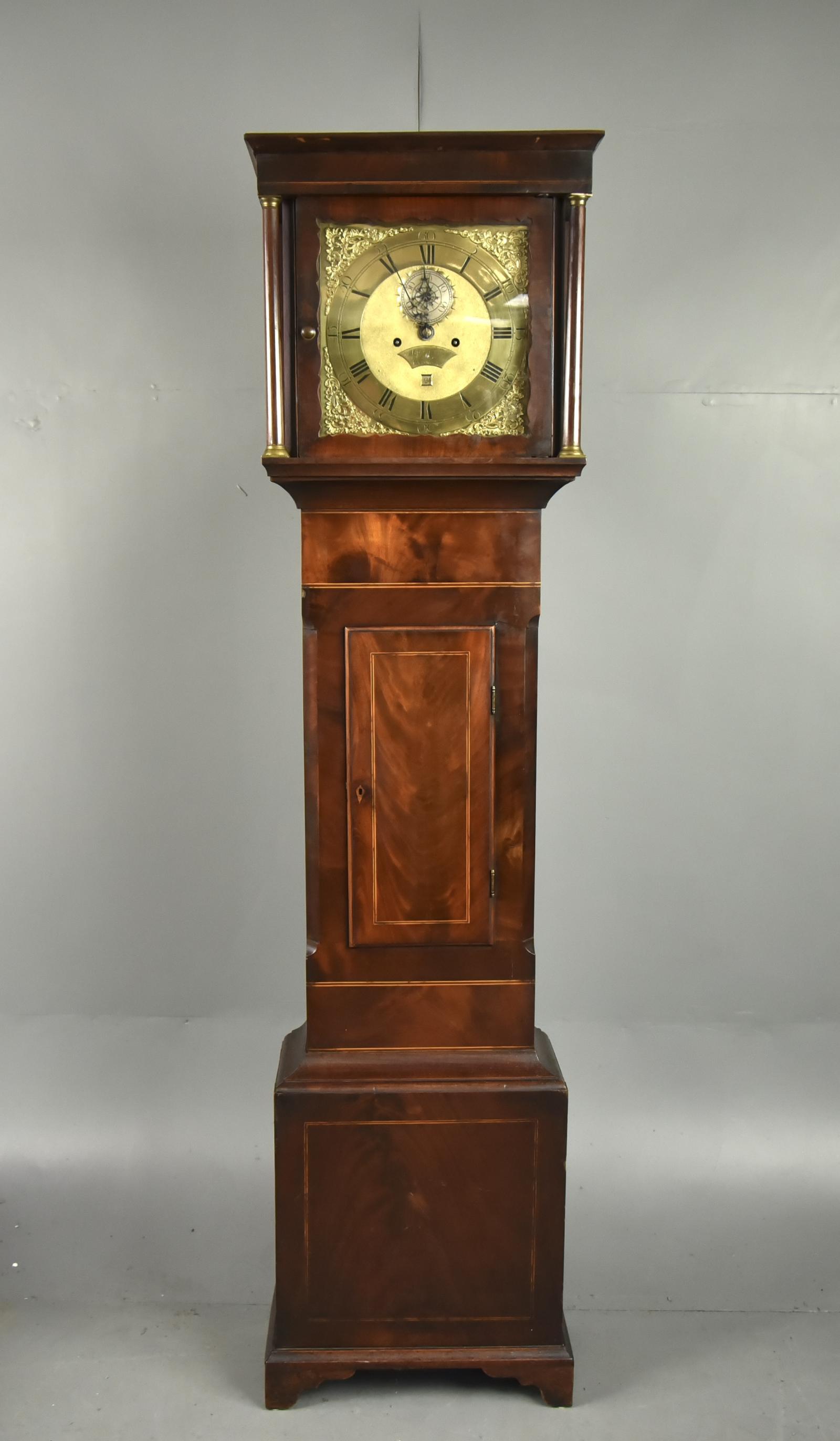 The clock is housed in a well-proportioned Georgian mahogany case with a flat-top hood and glazed door, flanked by turned columns. The long trunk door is fitted with a shaped and inlaid panel, above a stepped plinth base. The mahogany shows attractive figuring and a warm, well-developed patina, with colour and surface wear consistent with age.
