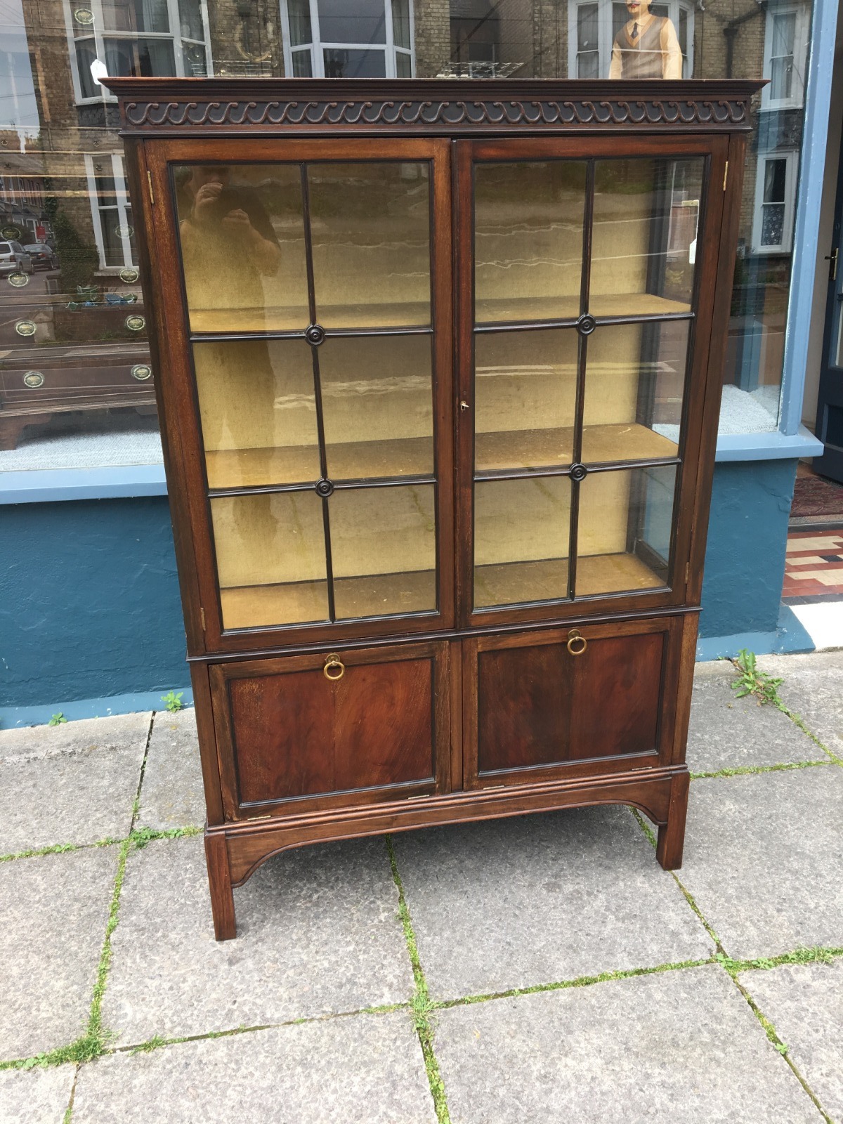 Antique Mahogany 2 Door Display Cabinet with 2 Drop Front Cupboard Doors