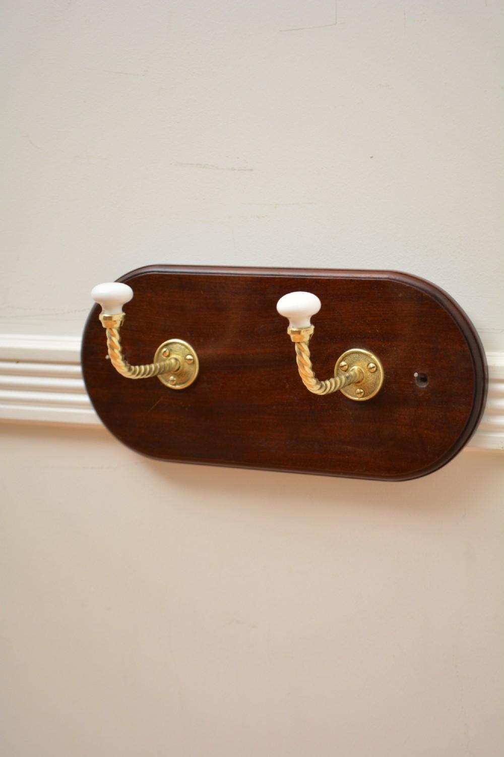 Pair of very stylish brass, twisted rope and ceramic coat hooks on solid mahogany backing with moulded edge. The coat rack retains its mellow colour and antique character, all cleaned, polished and ready to use at home. No woodworm, solid mahogany with no cracks or repairs. c1880