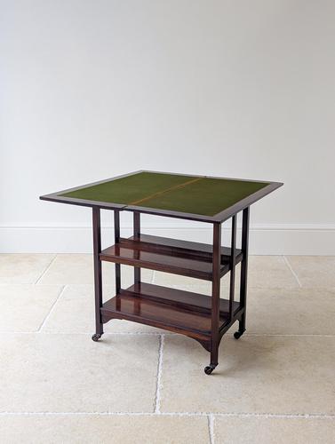 A finely made early 20th Century mahogany folding card table of practical and elegant design, the rectangular top swivelling and folding open to reveal an original green baize-lined playing surface. Quite unusually, the base incorporates a tiered bookshelf with two open shelves to each side, all raised on square supports terminating in their original small brass and ceramic castors. A refined example of interwar ingenuity. Compact, versatile and thoughtfully designed for the smaller drawing rooms or studies of the period. The warm dark tone of the mahogany contrasts attractively with the green baize interior, offering both function and charm in equal measure. Presented in very good antique condition with a rich polished surface and only light surface wear consistent with age. Structurally sound, clean and ready to place. English, circa 1920.