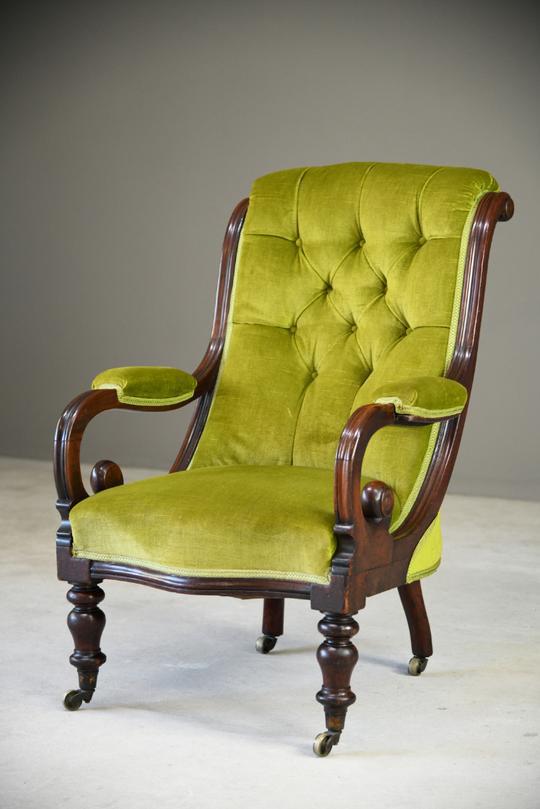 Antique Mahogany & Green Upholstered Armchair