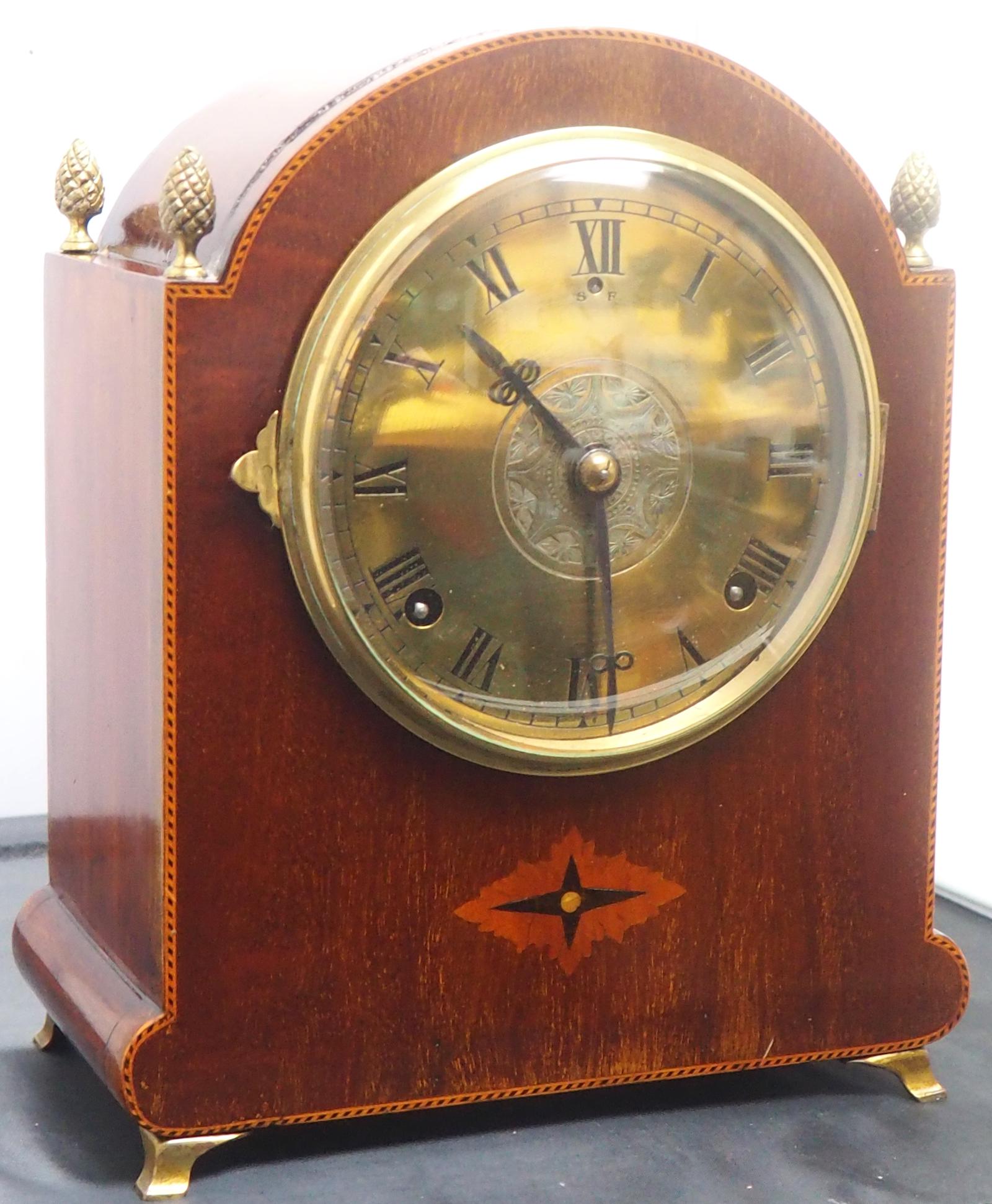 Antique Mahogany Inlaid Ormolu Finials 8 Day Striking Mantle Clock