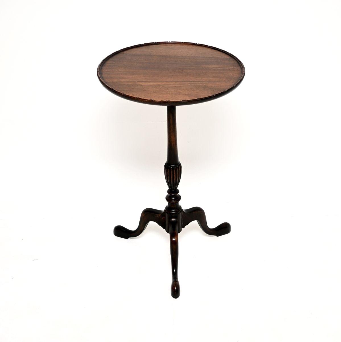 It is of superb quality, it is quite tall is a very useful item. The circular top has a slightly raised and beaded edge, it sits on an elegant yet sturdy tripod base with a fluted central support.