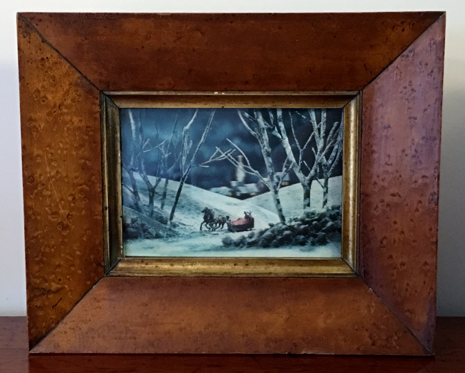 Antique Maple Framed 3D Autostereoscopic Image of a Winter Scene with Horse Drawn Sleigh