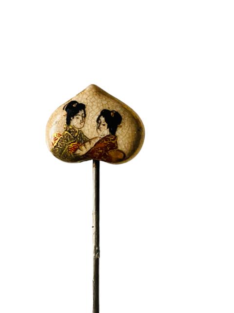 Antique Meiji Period Geisha Ladies Double Sided Heart Shape Satsuma Hat Pin c.1900