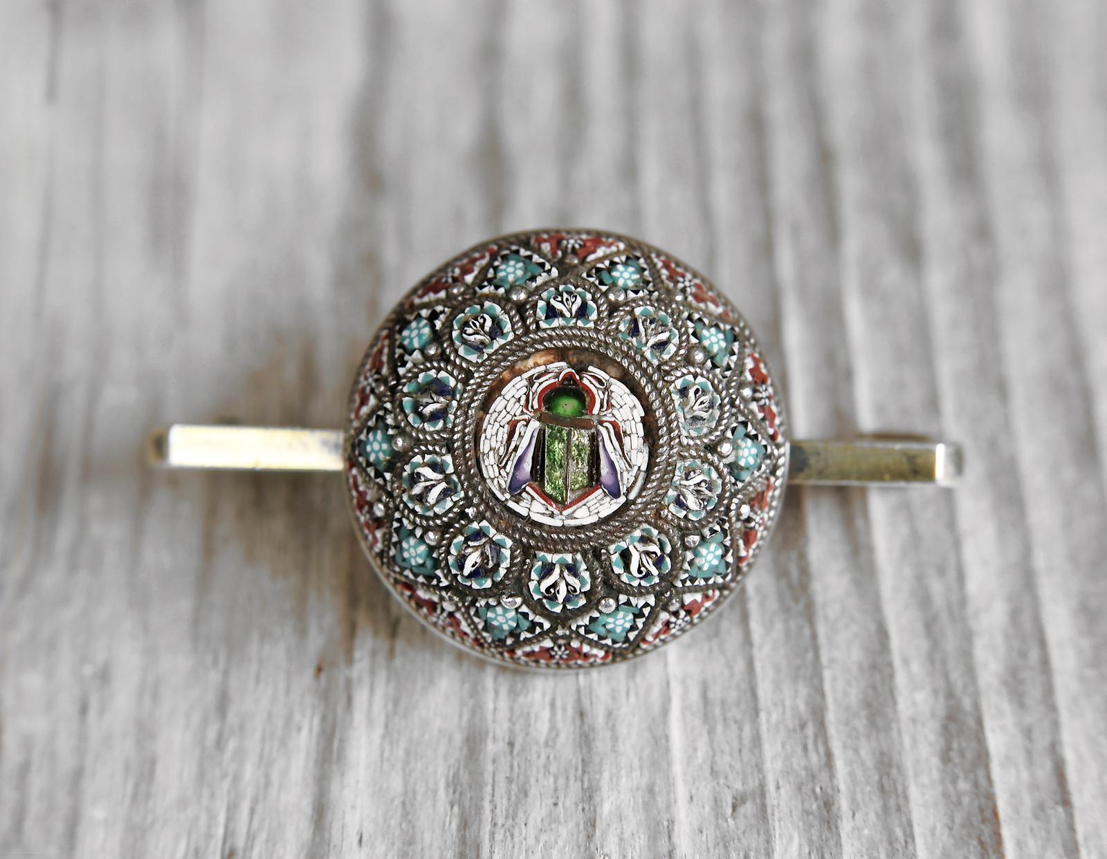 Antique Micro Mosaic Scarab Beetle on Silver Gilt Stock Pin, Brooch Mount c.1860