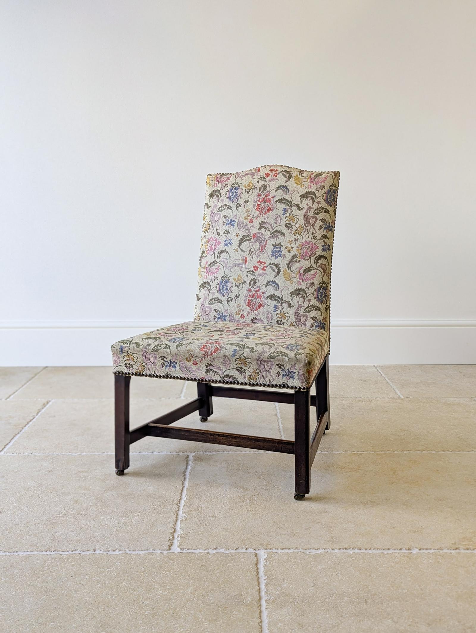 An early Victorian mahogany side chair of impressive form, upholstered in a particularly good quality floral fabric and raised on attractive understated block legs terminating in original small leather coated brass castors and united by a stretcher frame.