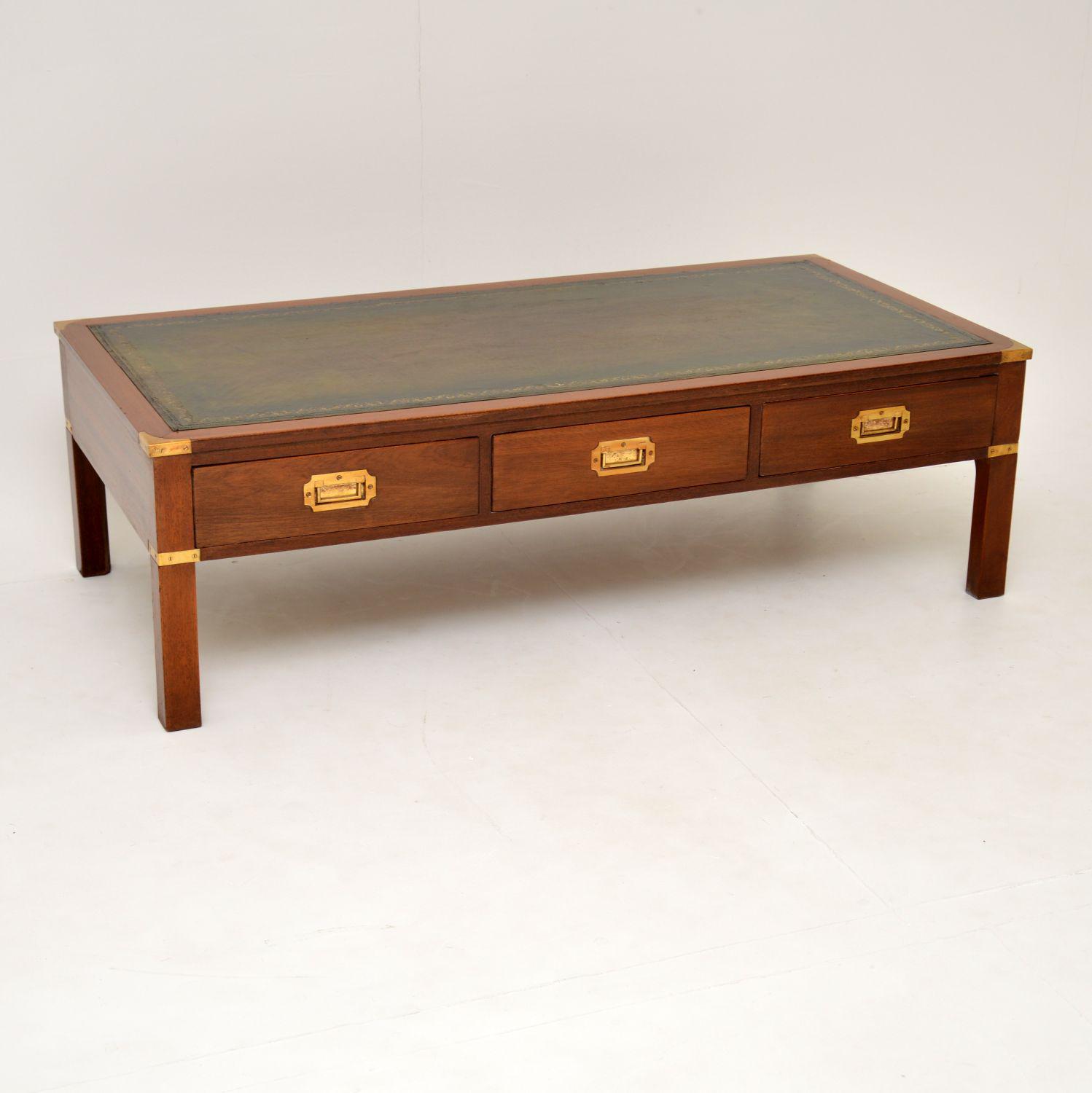 Antique Military Campaign Style Mahogany Leather Top Coffee Table