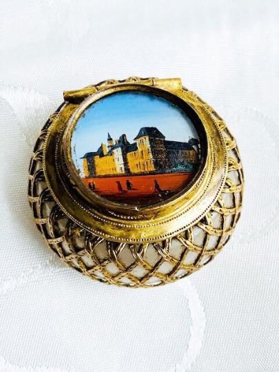 Antique Miniature Grand Tour White Opaline Gilt Ormolu Dressing Table Trinket / Powder Pot with Eglomise Painting c.1880 (1 of 10)