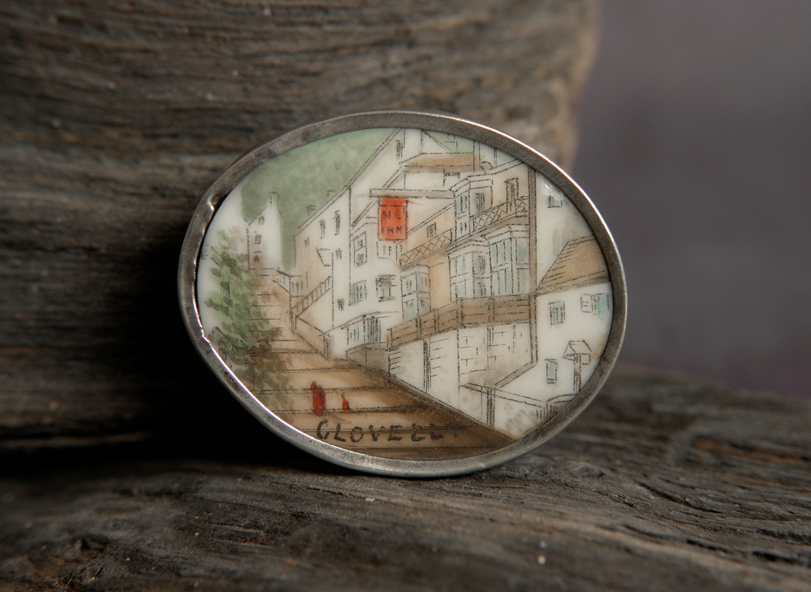 Antique Miniature Hand Painted Brooch, New Inn Clovelly, Victorian c.1880