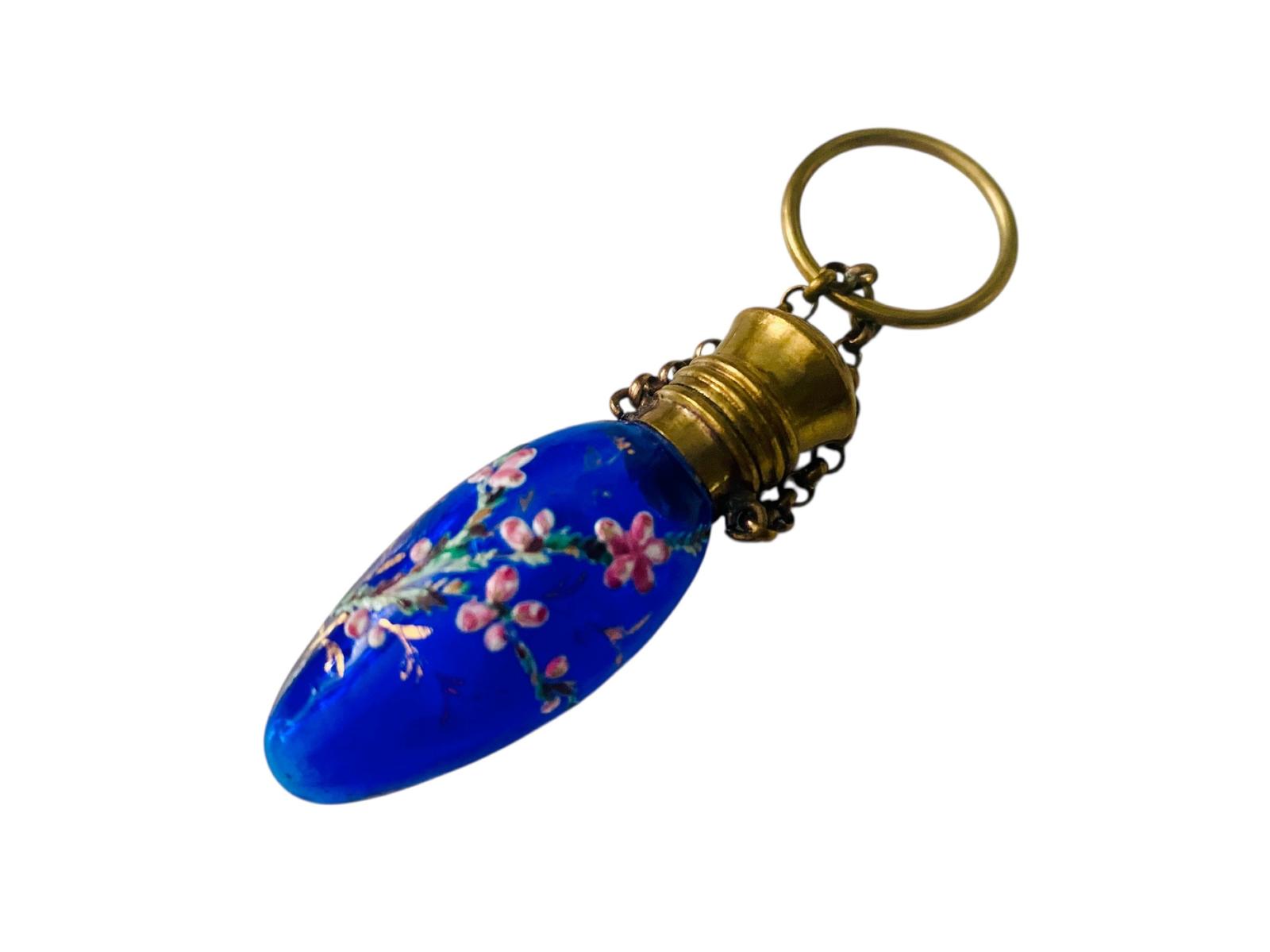 Fine antique miniature Moser chatelaine perfume bottle dating circa 1880. This scent bottle has a drop shape and is made of stunning bristol blue glass decorated with hand applied, raised enamel and gilt floral and foliate decoration. This antique perfume bottle is fitted with a gilt metal collar and hinged lid. The top of the lid has pretty engraved decoration and attached to the collar is the original suspensory chain and ring so that the bottle could be hung from a chain or chatelaine. The bottle retains the original matching bristol blue inner glass stopper.