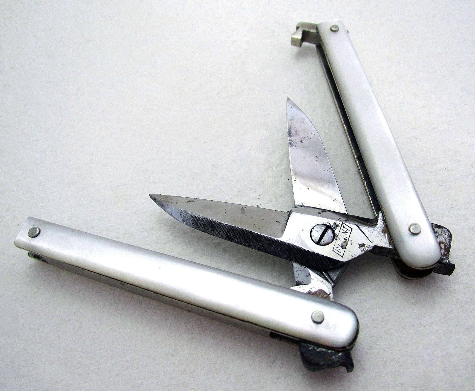 Antique Mother of Pearl Stainless Steel Patent Pocket Folding Manicure / Sewing Scissor C.1910