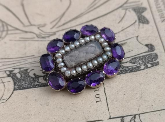 Antique Mourning Brooch, Georgian Amethyst & Seed Pearl, Hair Verso, Inscribed, 9ct Gold