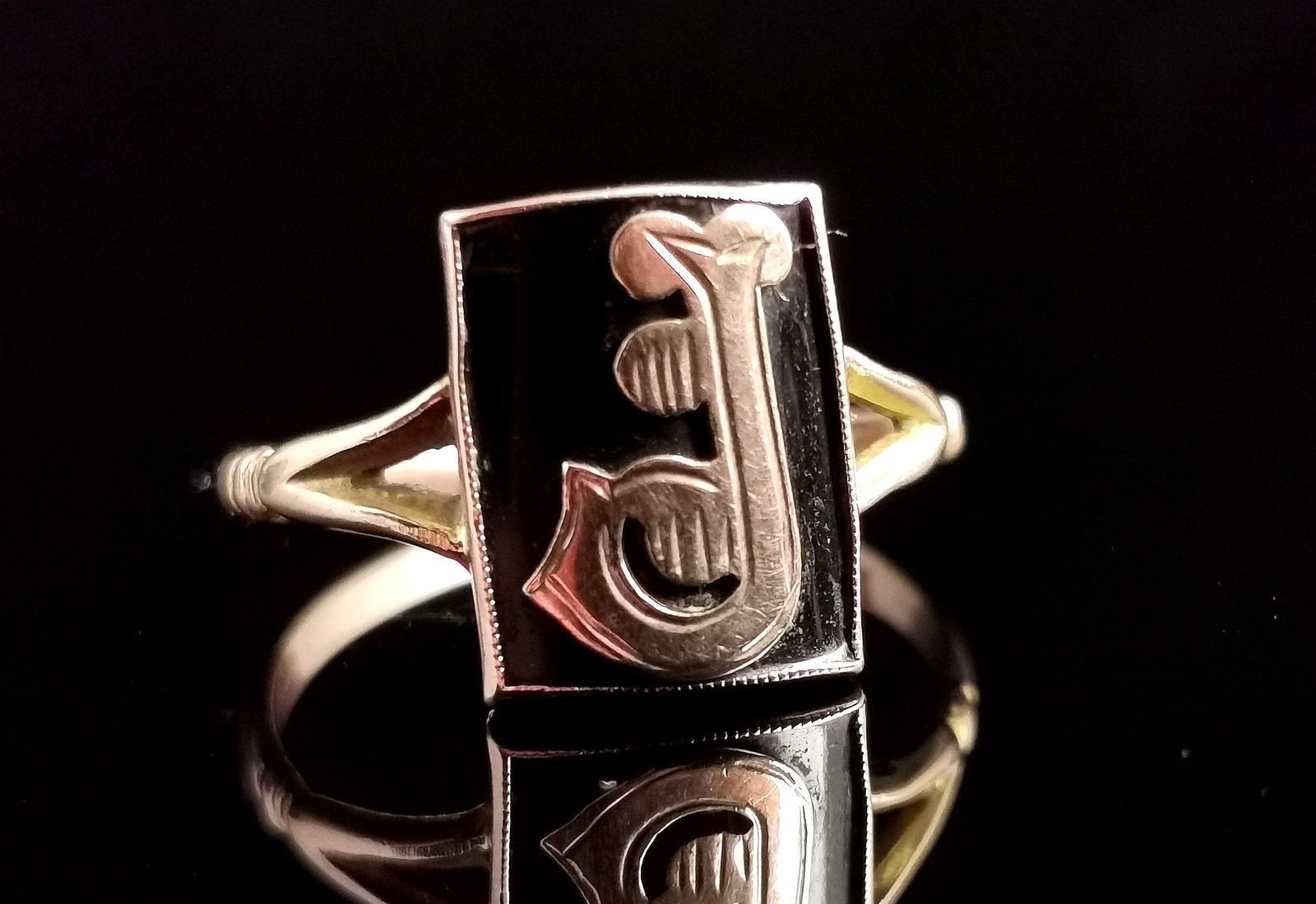 Antique Mourning Ring, 9ct Rose Gold, Onyx, Initial J, Edwardian