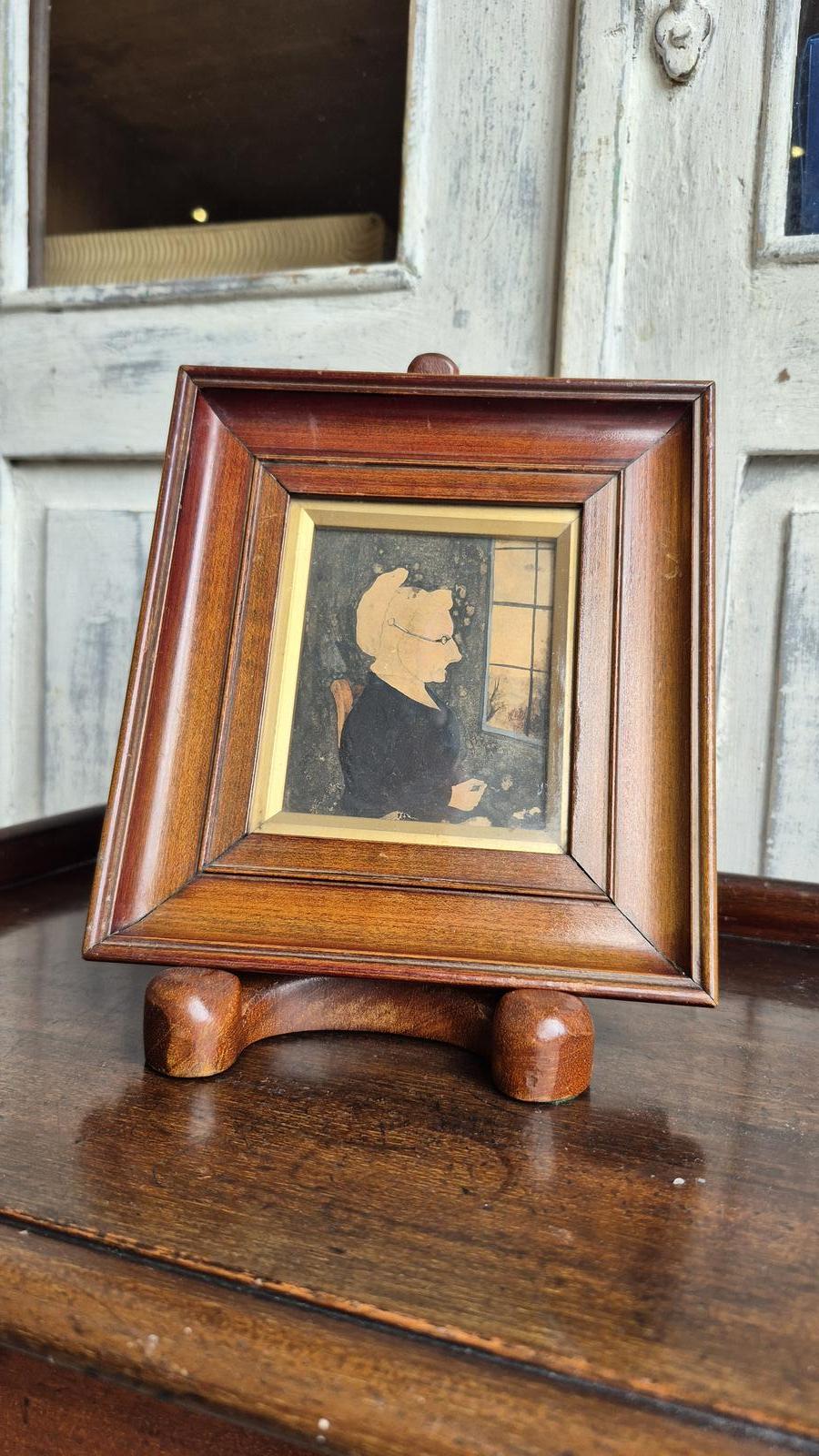 The piece is housed in a later, well-made wooden frame with a warm, polished finish that complements the tones of the artwork.