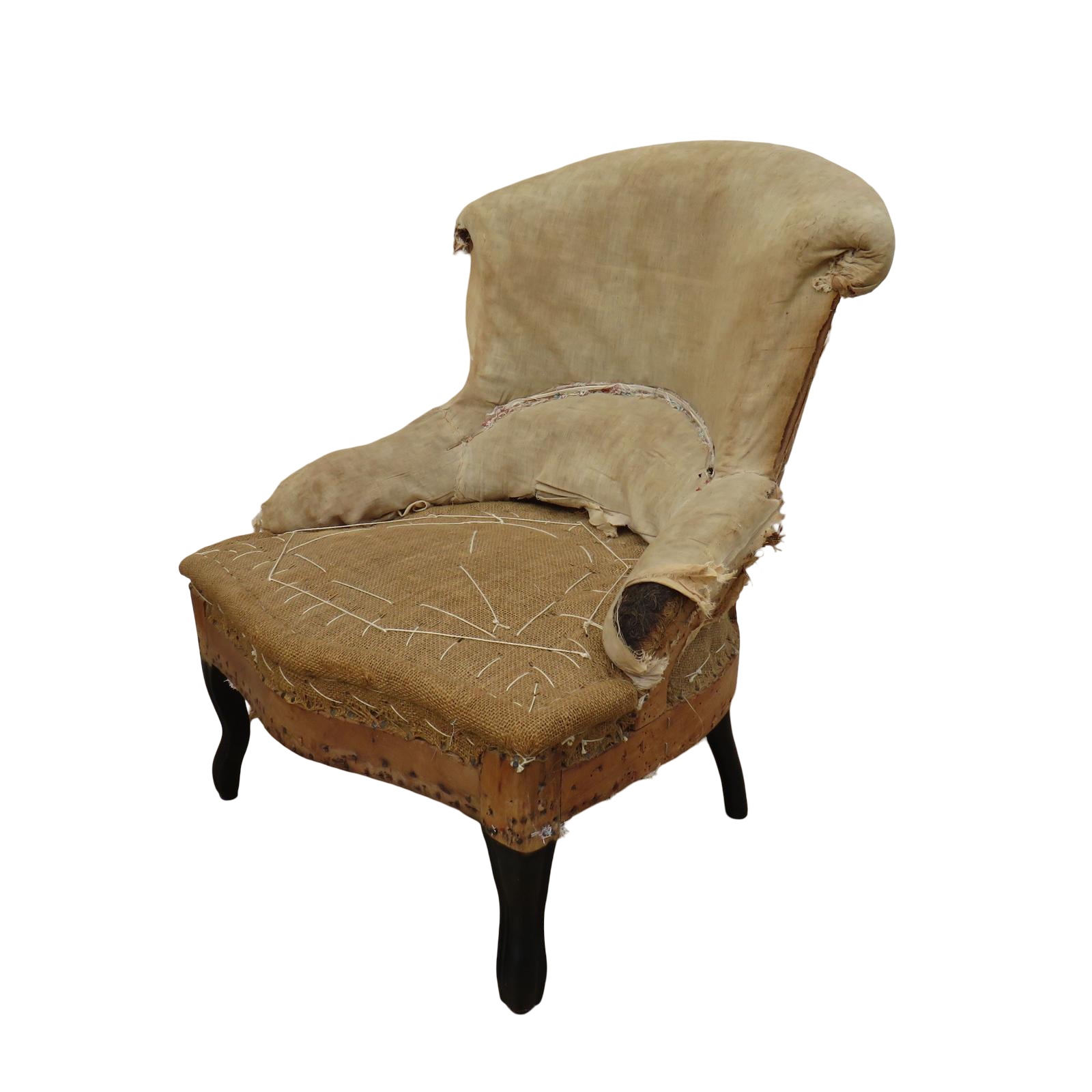 Shapely, sound, sturdy and sprung 19th century French serpentine fronted Napoleon III crapaud slipper, boudoir, nursing, tub armchair on ebonised legs for re-upholstery.