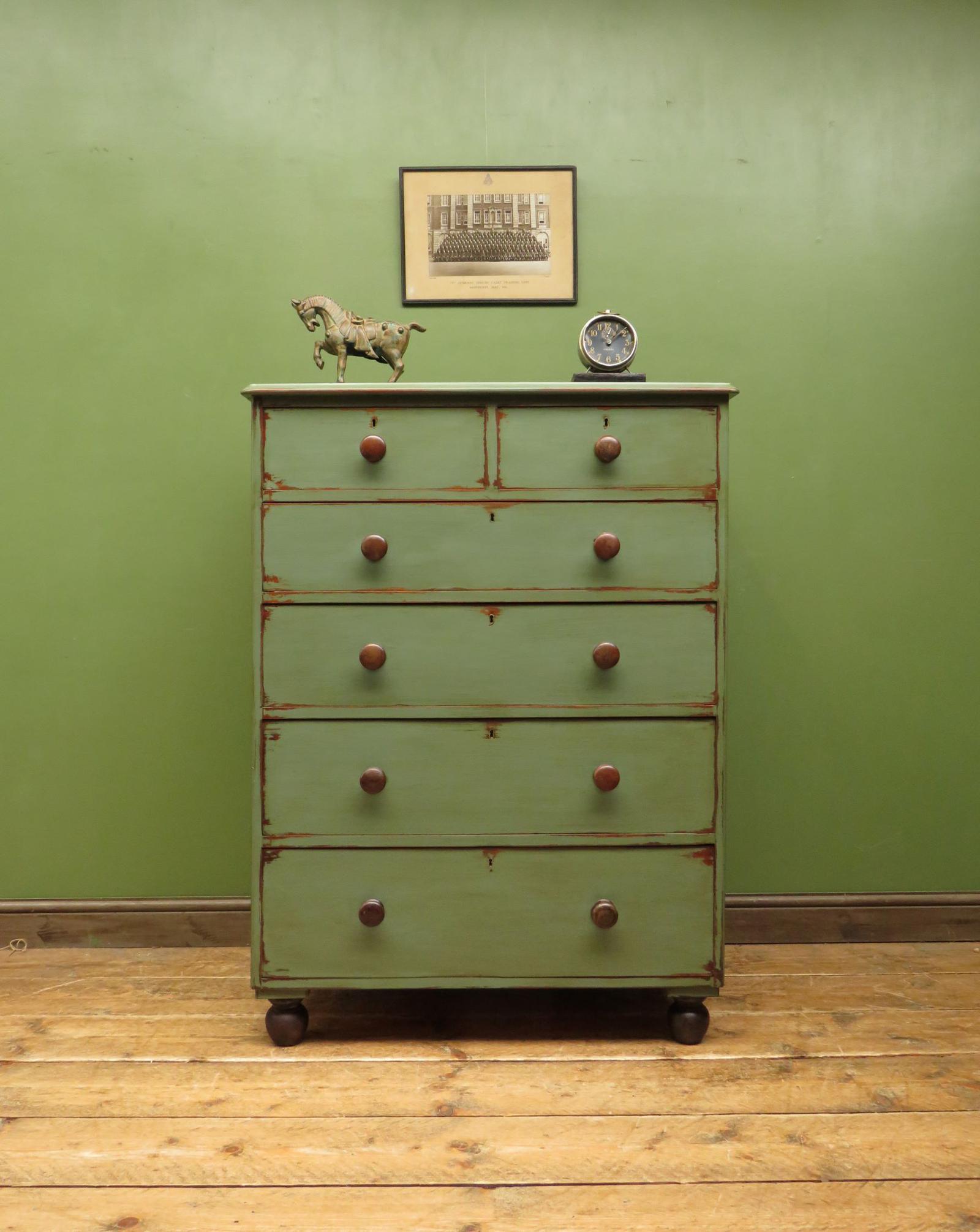 Antique Narrow Green Painted Chest of Drawers, Botanical Green Shabby Chic