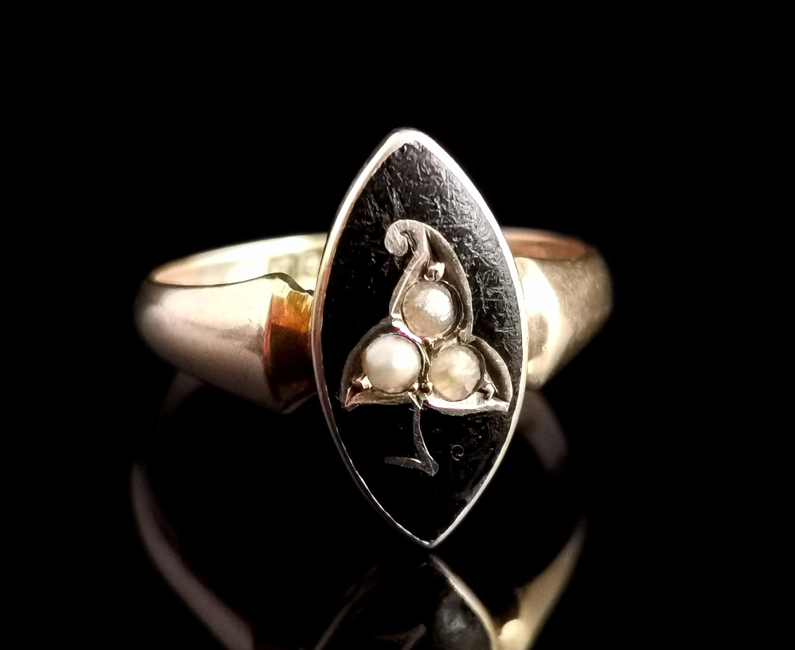 Antique Navette Mourning Ring, Black Enamel & Pearl, Ivy Leaf, 9ct Gold