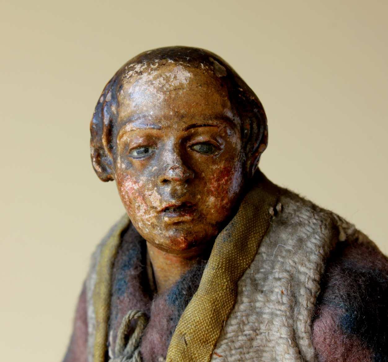 This early 19th century Neapolitan crib figure which would have been hand made using clay for the head, legs and arms is dressed in hand stitched clothing and has a real charm.