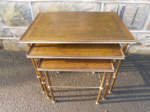 Antique Nest 3 Brass & Leather Tables c.1920