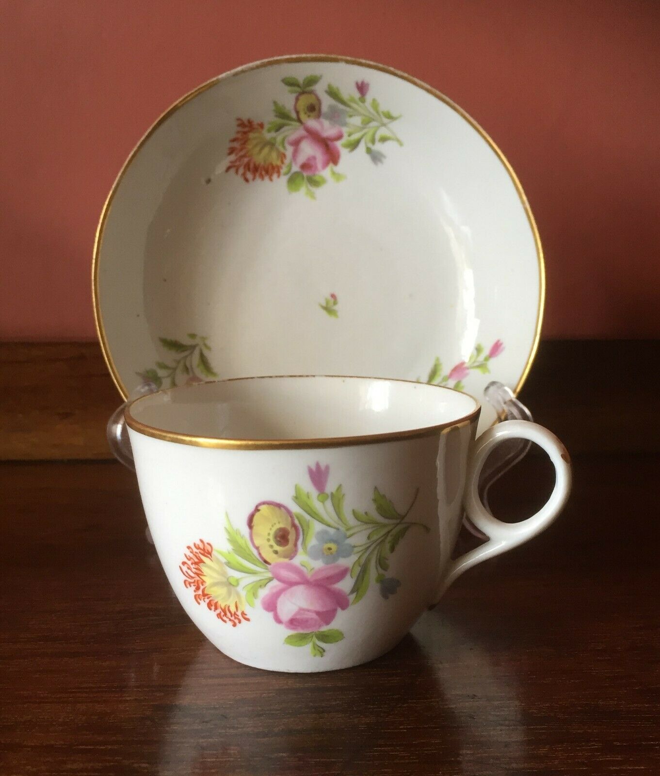Antique New Hall Porcelain Bute Shaped Tea Cup & Saucer, Hand Painted