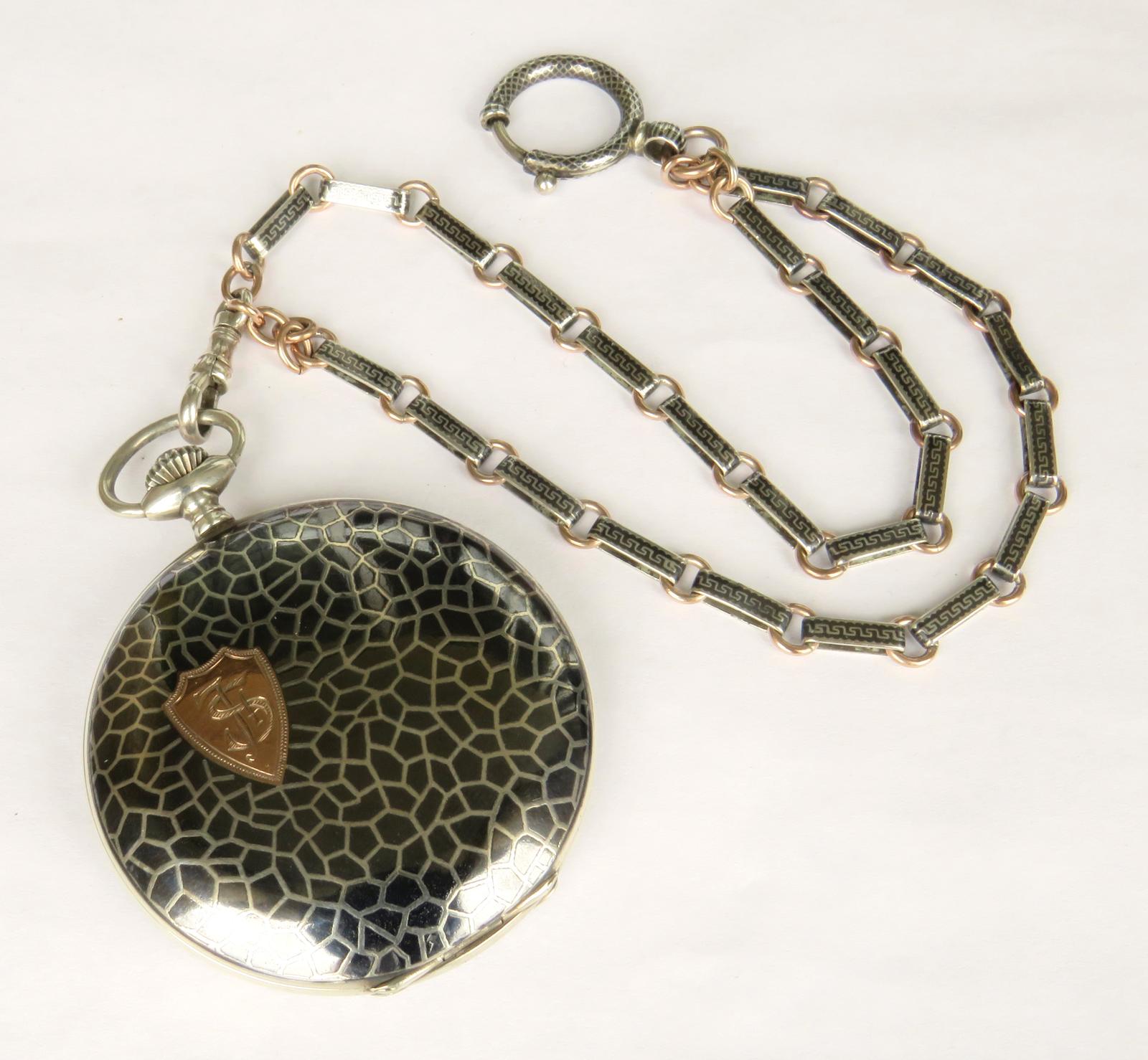 Antique Niello Ware Favor Full Hunter Pocket Watch & Chain