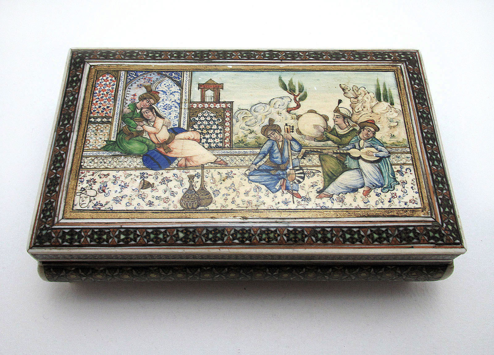 Antique North Indian Mughal Art Hand Painted Miniature Painting Persian Sadeli Box, Courtyard Scene & Musicians, India C.1900 (1 of 1)