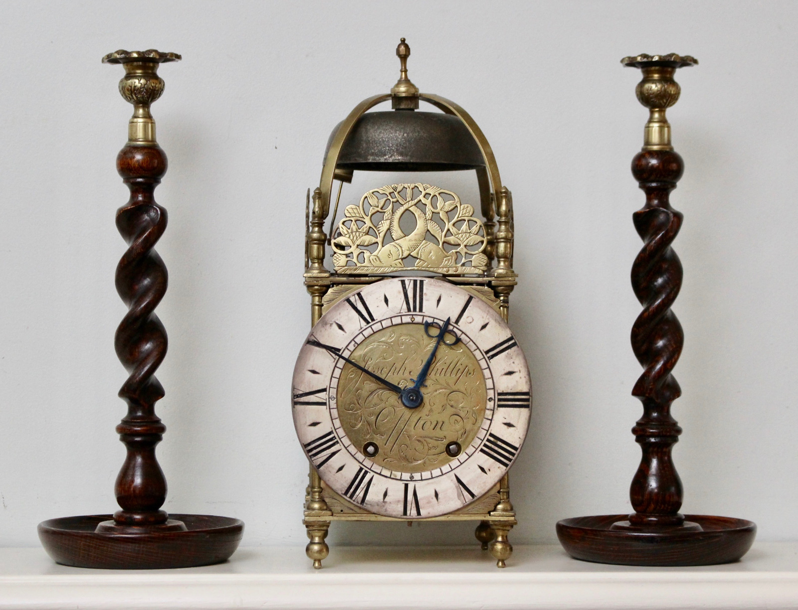 Antique Oak Barley Twist Candlesticks with Brass Sconces