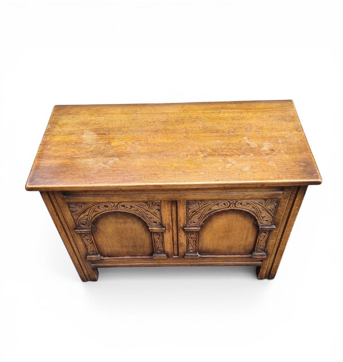 A beautiful solid oak blanket chest featuring richly carved front panels with decorative Gothic style arches and foliate detailing.