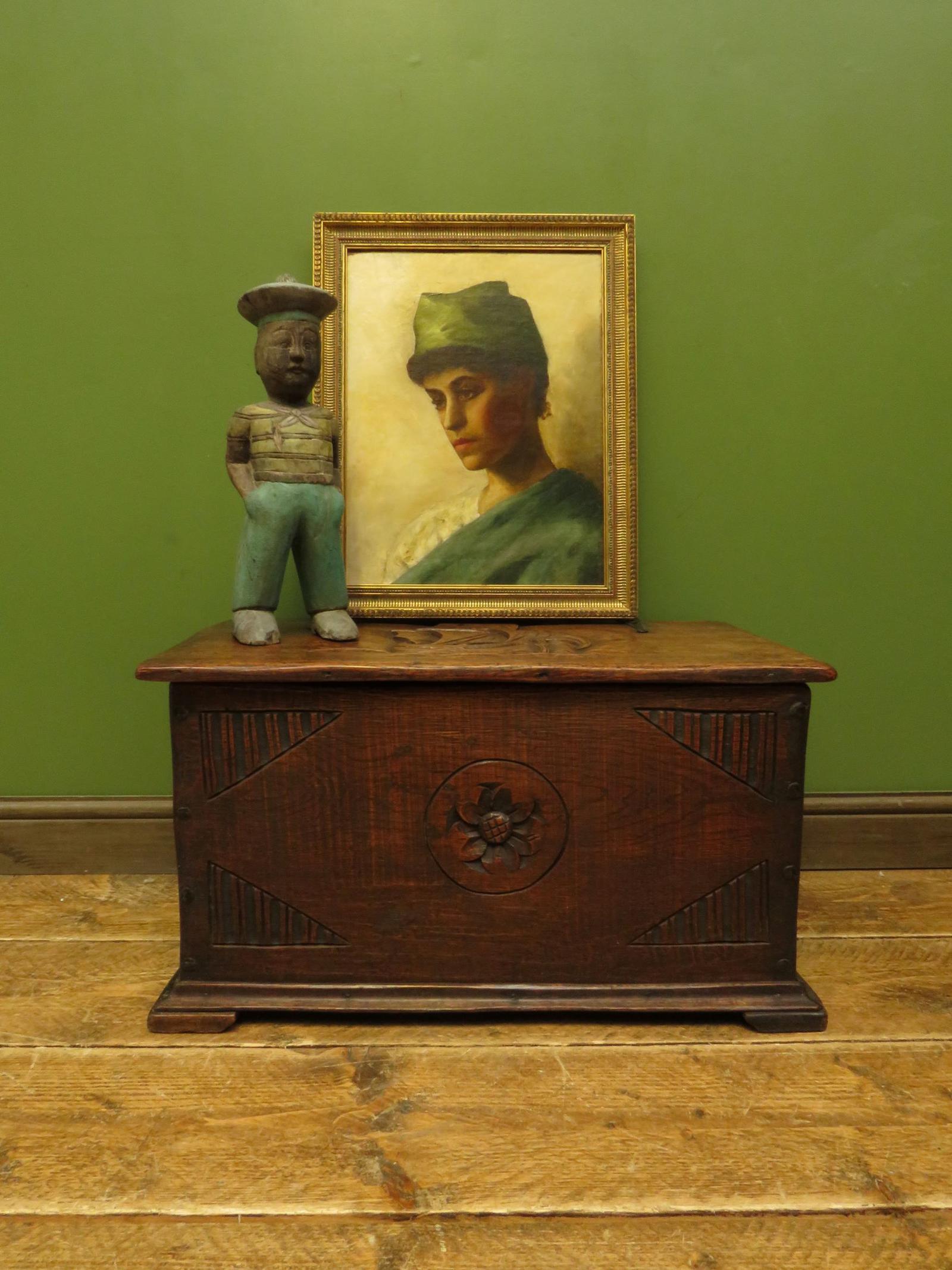 Antique Oak Chest with Carved Ship Detail to Lid Maritime Nautical Storage Chest